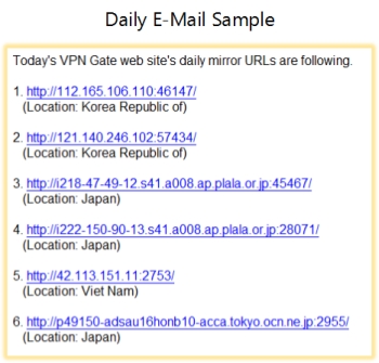 VPN Gate サービスは、最新のミラーサイト URL 一覧を電子メールで 1 日に 3 通配信します。メール配信サービスに登録すると、最初のメールが直ちに配信され、以後約 8 時間ごとに最新の URL 一覧が送信されます。